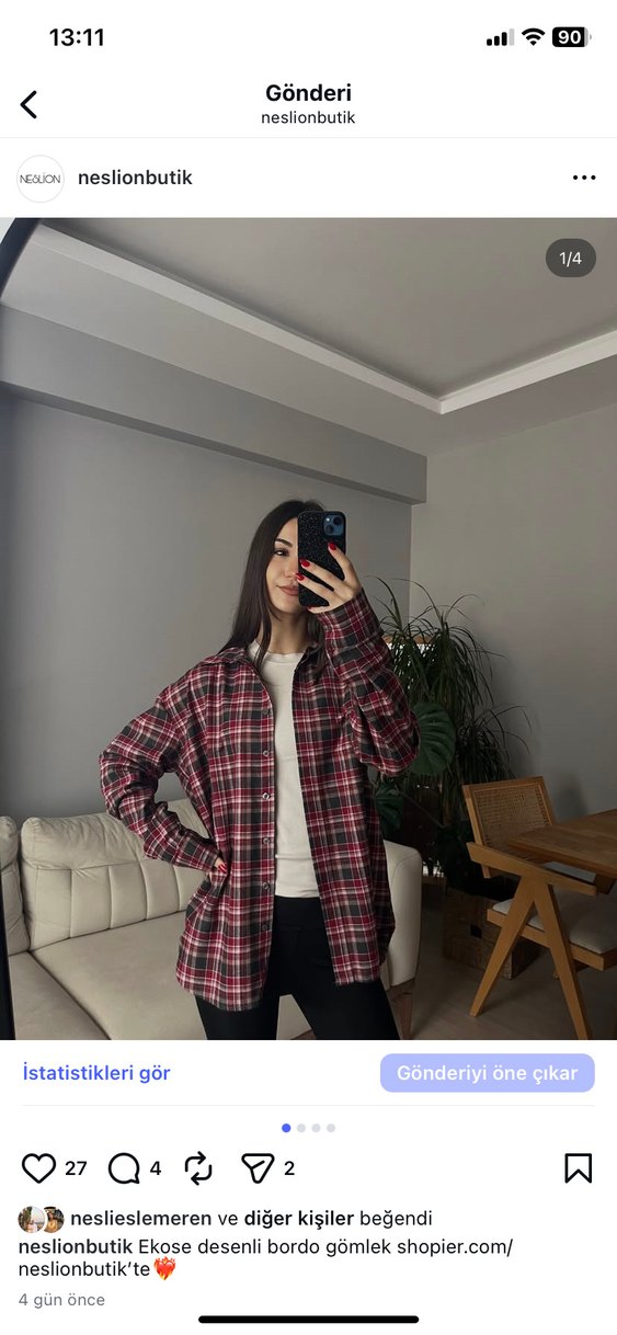 Bordo Ekose Desenli Düğmeli Kadın Gömlek