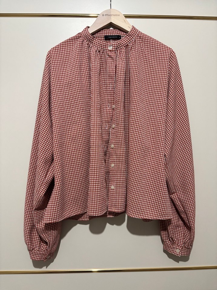 Bordo ekose desenli, düğmeli, yuvarlak yaka, pamuklu, bol kesim uzun kollu kadın gömleği. Rahat ve günlük kullanıma uygun.