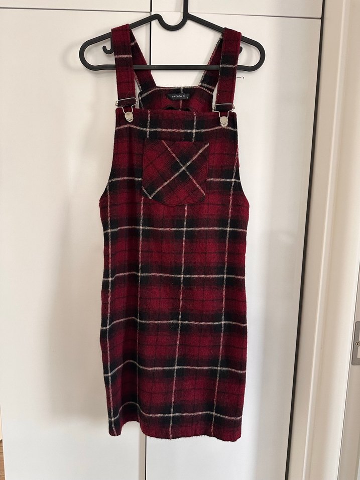Bordo ekose desenli kadın askılı midi salopet, bol kesim ve tokalı askılara sahiptir. Ön cep ve halter yaka stiliyle yumuşak tekstil kumaştan yapılmıştır.