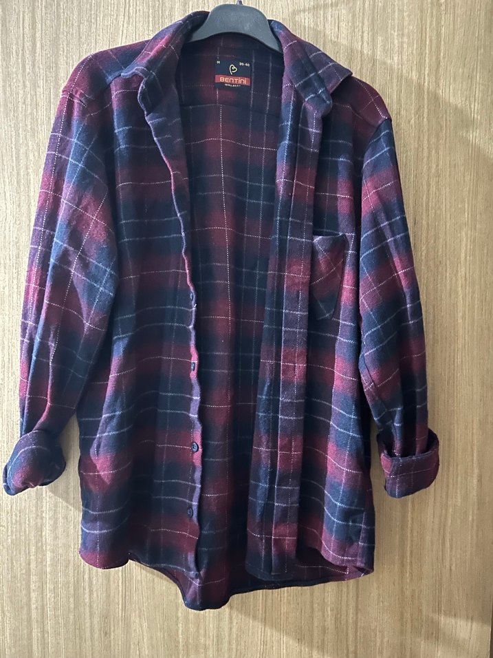 Kadınlar için yumuşak yün kumaştan, düğmeli, uzun kollu ve notched lapel yakalı, bordo ekose desenli, rahat kesim gömlek. Günlük kullanıma uygundur.