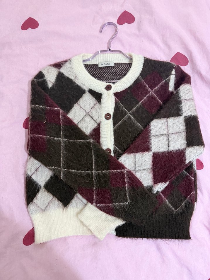 Bordo ekose desenli, uzun kollu ve bol kesim kız hırka, yumuşak örme kumaştan bohem tarzda üretilmiştir.