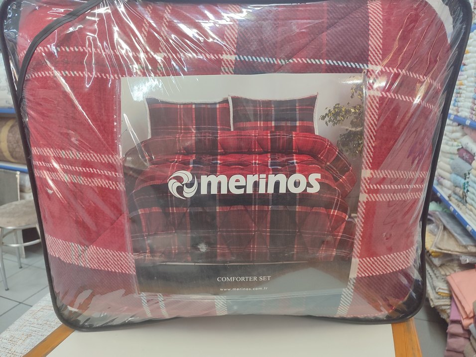 Merinos marka bordo renkli, ekose desenli yorgan seti, sıcak ve şık bir uyku ortamı sunar. ️