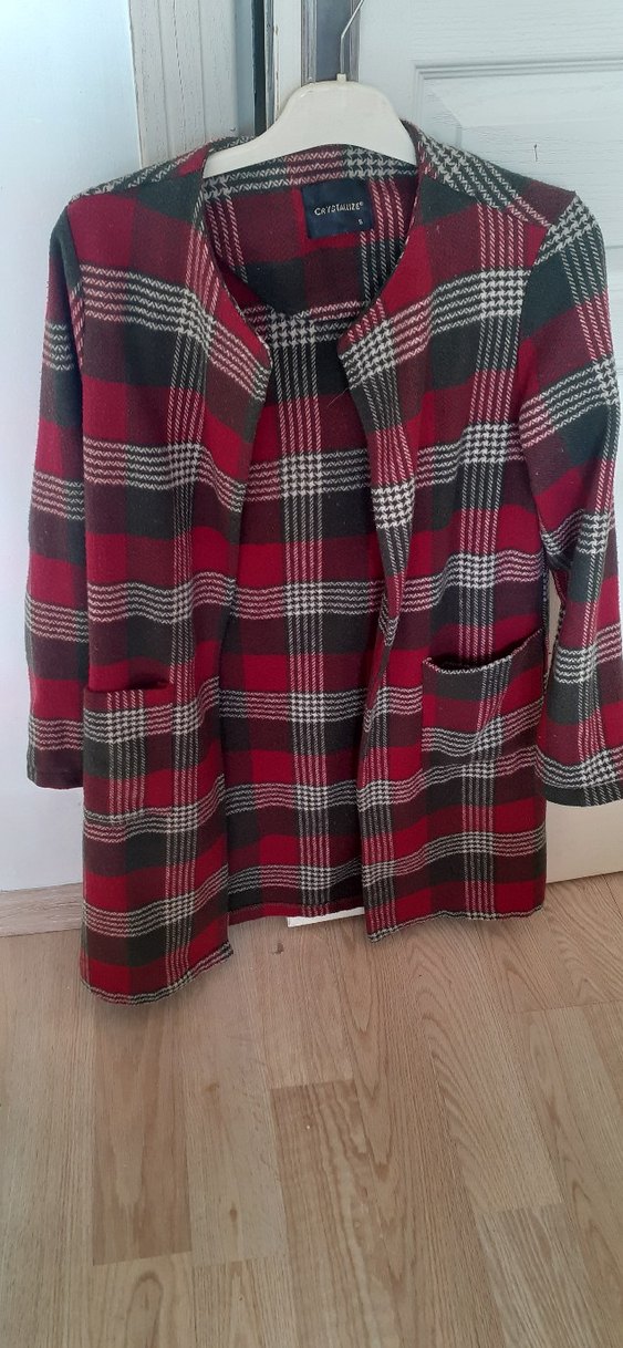 Bordo ekose desenli, düğmeli ve uzun kollu kaban. Normal boyda, ve notched yaka detaylı, günlük kullanıma uygun.