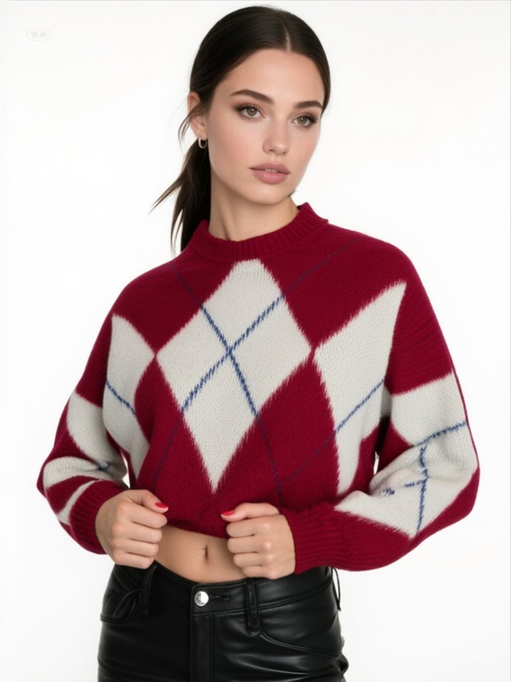 Bordo renkli, örgü dokulu, ekose desenli kadin kazak. Yuvarlak yaka ve uzun kollu, rahat kesim ile günlük kullanıma uygun.