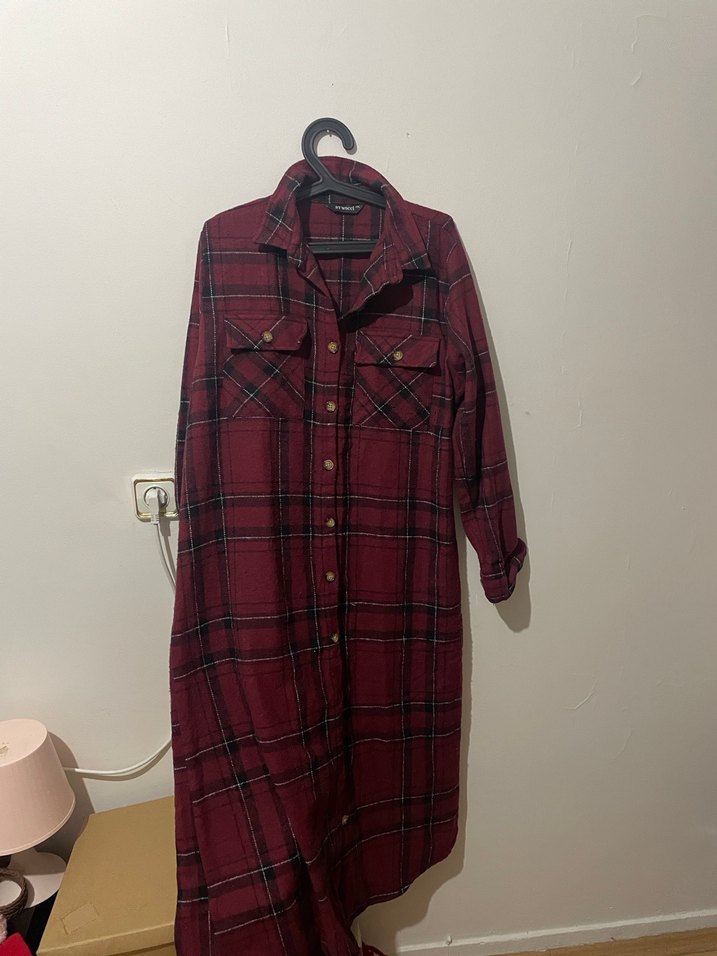 Bordo renkte, düğmeli önü, bol kesimi ve ekose desenli uzun kadın gömleği. Uzun kollu ve kesik yaka detayıyla, rahat ve şık bir sokak tarzı sunar.