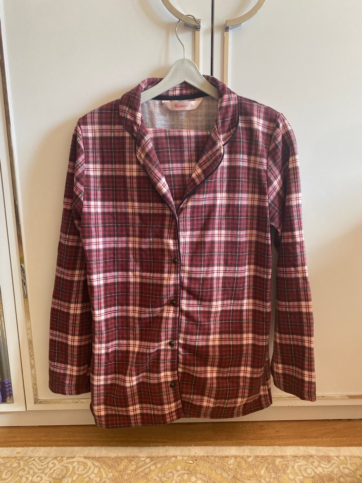 Bordo ekose desenli, düğmeli, uzun kollu, normal boy midi kadın pijama takımı. Notch yaka ve regular kesim ile günlük kullanıma uygundur.