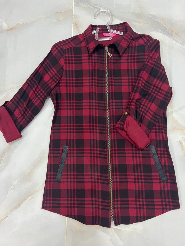Ürün bir kere kullanıldı. Herhangi bir deformasyonu yoktur. Ürün ölçüleri fotoğraflarda mevcuttur. Bordo ekose desenli kadın gömlek, uzun kollu ve yakalıdır. Fermuarlı ön kapama ve iki cep bulunur. Yumuşak sentetik kumaştan yapılmış, rahat kesim ve uzun boydur.