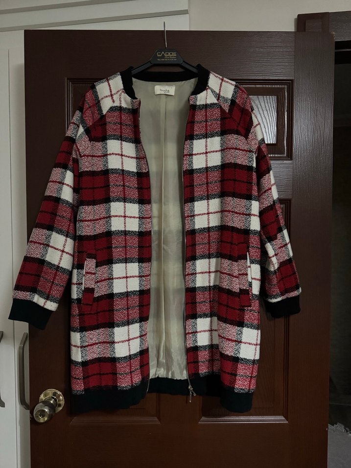 Bordo ekose desenli, uzun kollu kadın kaban. Bol kesim ve düğmeli olup, rahat sentetik kumaştan yapılmıştır. Günlük kullanıma uygundur.