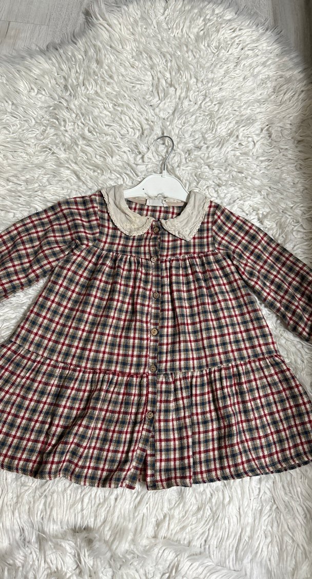 Bordo ve gri ekose desenli, düğmeli, yakası dantelli, uzun kollu bol kesim kız elbisesi.