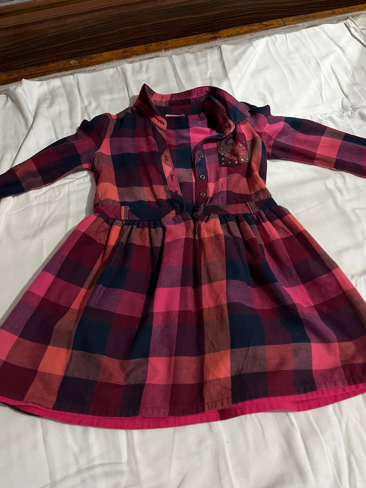 Bordo ekose desenli, düğmeli, uzun kollu, yakalı, bol kesim kız elbisesi. Tekstil kumaştan yapılmış, bohem tarzında nostaljik bir model.