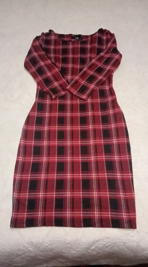 Bordo ekose desenli, uzun kollu, tek düğmeli, tek vücut oturan midi elbisedir. Günlük kullanıma uygundur.