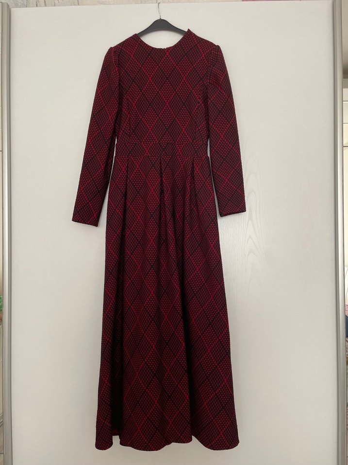 Bordo renkli, ekose desenli uzun kollu uzun elbise. Regular kesim ve pile detaylı, pamuklu dokuma kumaştan yapılmıştır. Düğün ve bayramlar için harika