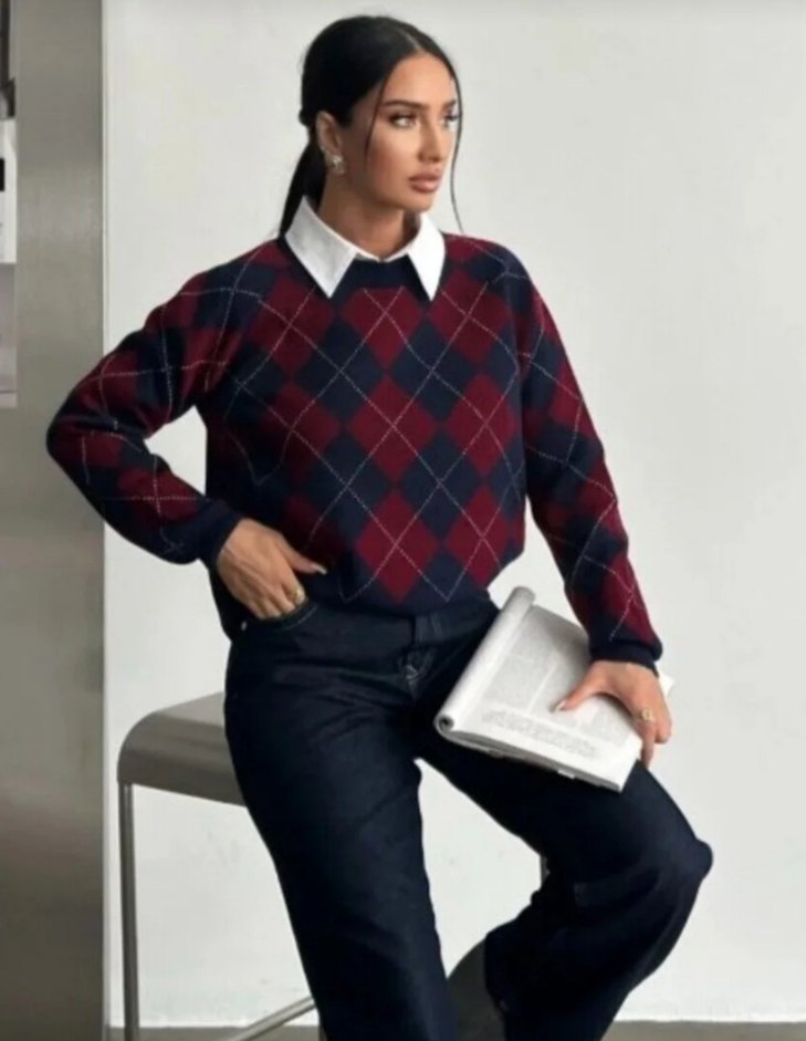 Bordo ekose desenli yün kazak, uzun kollu ve normal boyda, regular fit kalıptadır. Günlük sokak stiline uygundur.