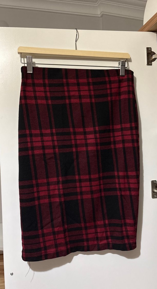 Bordo ekose desenli, sentetik kumaştan yapılmış, drapeli ve oturan kesime sahip midi etek. Ofis kullanımı için uygundur.