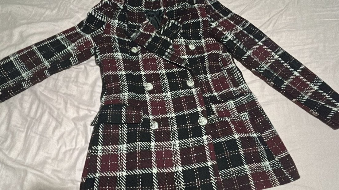 Bordo ve siyah ekose desenli, düğmeli, uzun kollu, normal kesim midi uzunluğunda kadın kaban. Paris tarzı günlük kullanıma uygun şık sokak modası görünümü sunar.