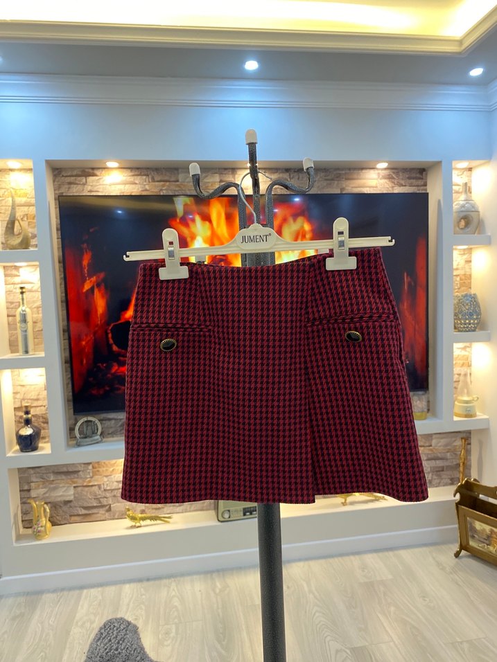 Bordo ekose desenli, düğmeli mini etek. Sentetik kumaştan, regular fit ve günlük sokak stili için uygundur.