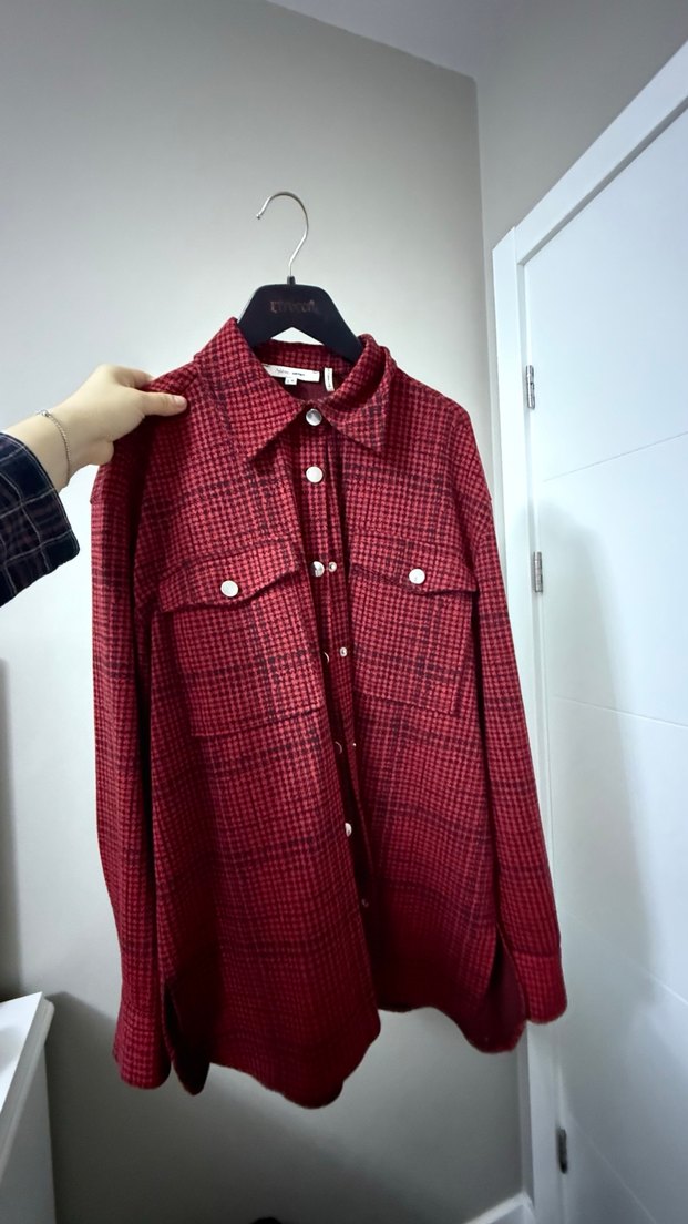 Bordo ekose desenli, düğmeli ve notalı yaka detaylı, uzun kollu, midi boy bol kesim gömlek. Günlük kullanım için uygun.