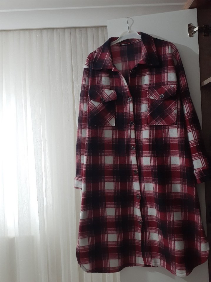 Bordo ekose desenli, yakalı ve düğmeli, uzun kollu midi uzunlukta, rahat kesim kadın gömleği. Yumuşak sentetik kumaştan, günlük sokak stili için uygundur.