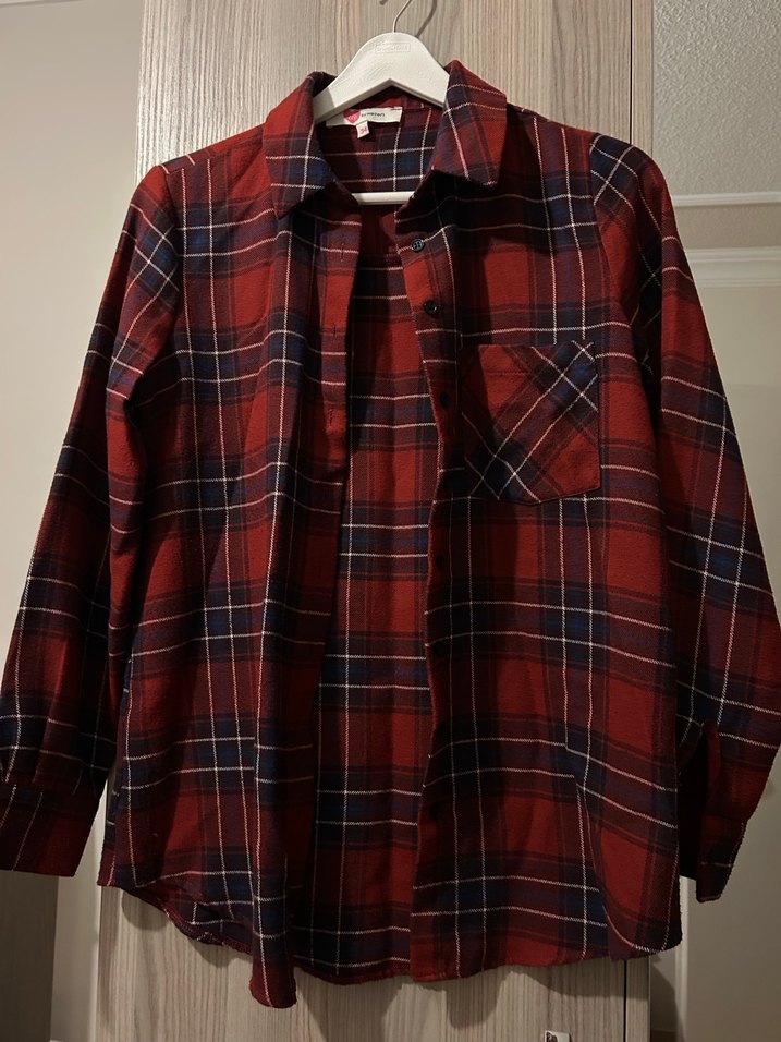 Bordo ekose desenli, düğmeli ve uzun kollu kadın gömleği. Normal boyda, bol kesim ve kumaştan üretilmiştir. Günlük rahat kullanım için uygundur.
