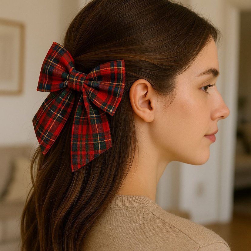 Sentetik kumaştan yapılmış, bordo ekose desenli fiyonk saç tokası, vintage Paris tarzında.