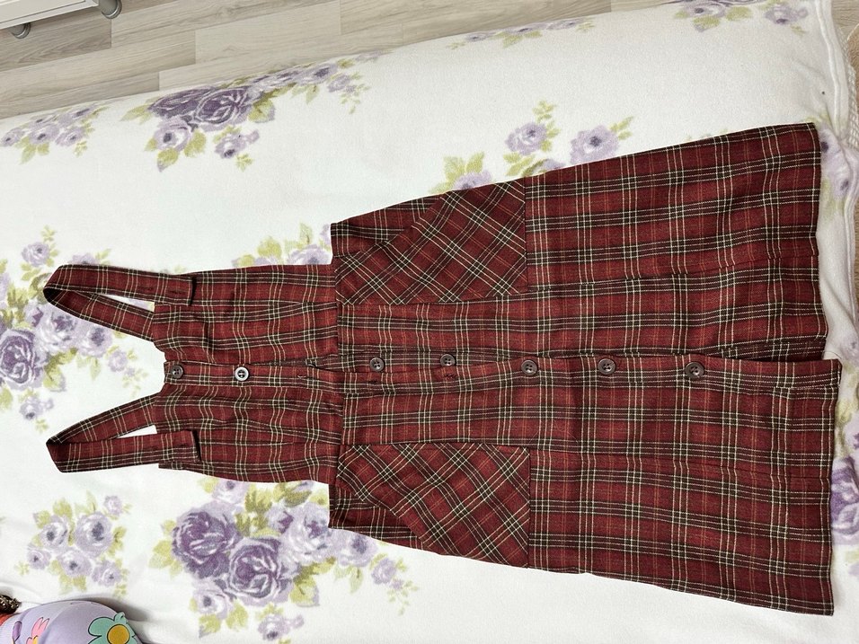 Koyu bordo renkte, klasik ekose desenli mini elbise. Düğmeli ön kısmı ve kullanışlı cepleri bulunur.