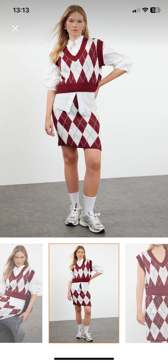 Bordo Ekose Triko Mini Etek Ve Süveter Takım