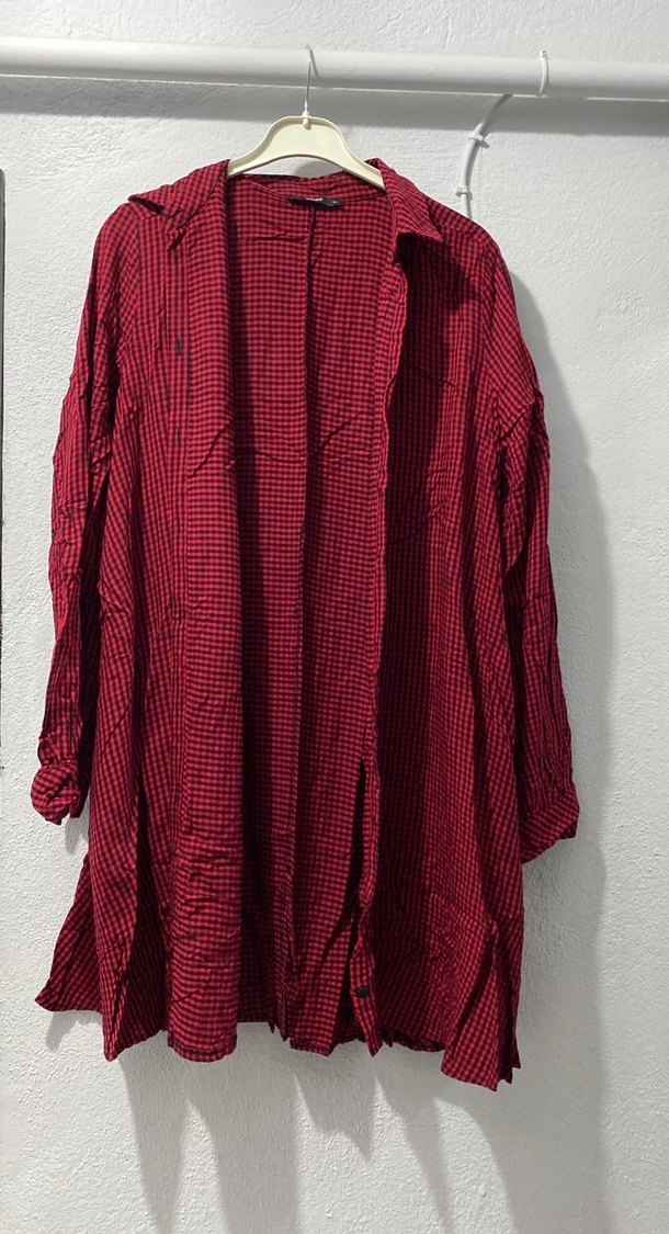 Bordo ekose desenli, uzun kollu kadın gömlek. Notlu yaka ve düğmeli ön kısmı ile rahat kesim, yumuşak keten kumaştan üretilmiştir. Etek kısmına doğru açılan bir modeldir