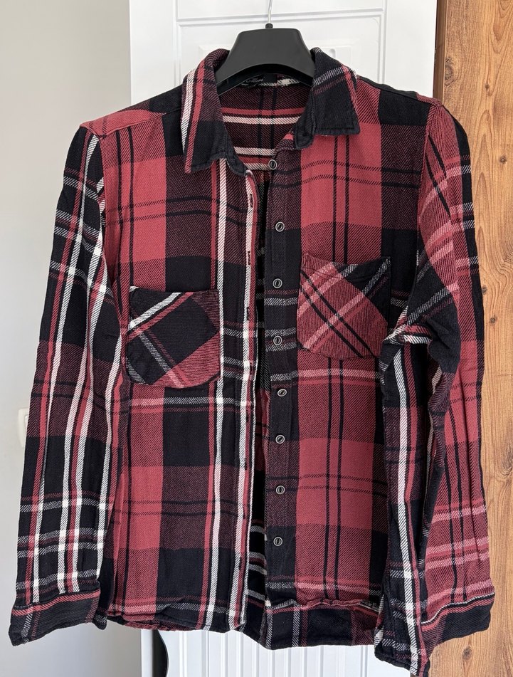 Bordo ekose desenli, uzun kollu, düğmeli, bol kesim kadın gömlek. Notch yaka ve günlük rahat stil için uygundur.