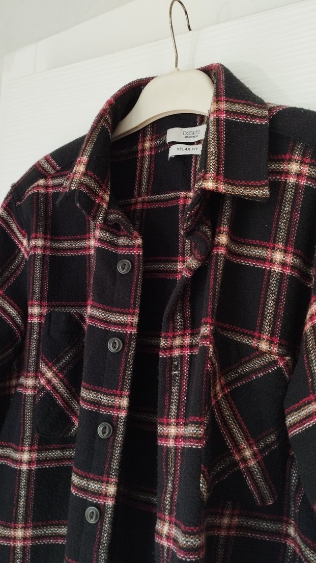Düğmeli, uzun kollu ve kesik yakalı gömleği. Yumuşak yün kumaştan, bol kesim ve bordo ekose desenlidir. Rahat sokak stili için ideal.