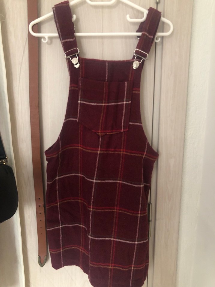 Bordo ekoseli, askılı, tokalı kayışlarla ayarlanabilen, bohem tarzda, yumuşak dokulu kumaştan geniş kesim kız salopet.