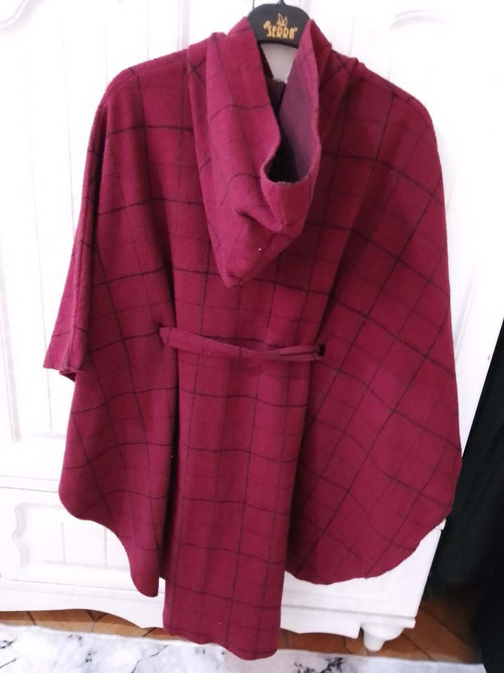 1 defa giyildi diyebilirim YENİ GİBİ tertemiz Bordo ekoseli, boğazlı ve salaş kesim kadın panço. Yumuşak ve sıcak kumaştan, midi boyda, askılı kollu, günlük kullanıma uygun.