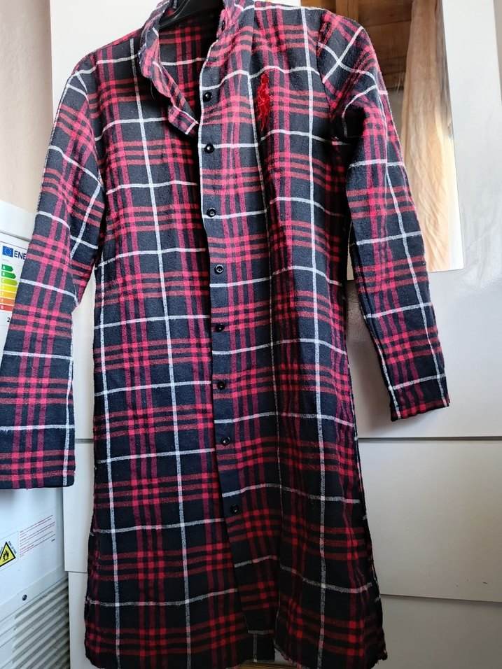 Bordo ekoseli, düğmeli, uzun kollu ve geniş kesime sahip gömlek. Yumuşak sentetik kumaştan üretilmiştir, günlük kullanıma uygundur.