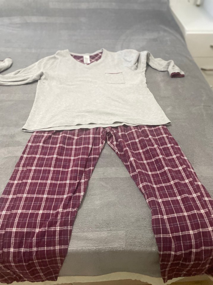 Gri uzun kollu üst ve bordo ekoseli midi pantolondan oluşan, rahat kesimli erkek pijama takımı.
