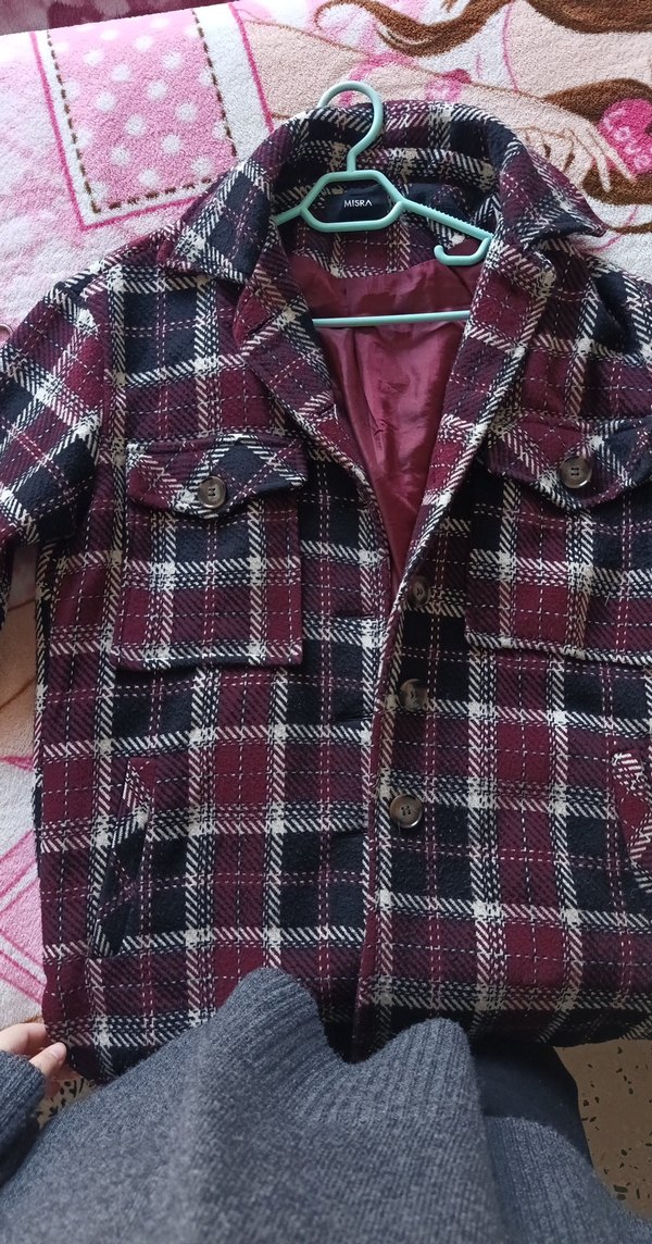 Bordo renkli, düğmeli ve yakalı kadın gömlek ceket, yumuşak sentetik kumaştan üretilmiştir. Uzun kollu, midi boyda ve rahat kesimdir.