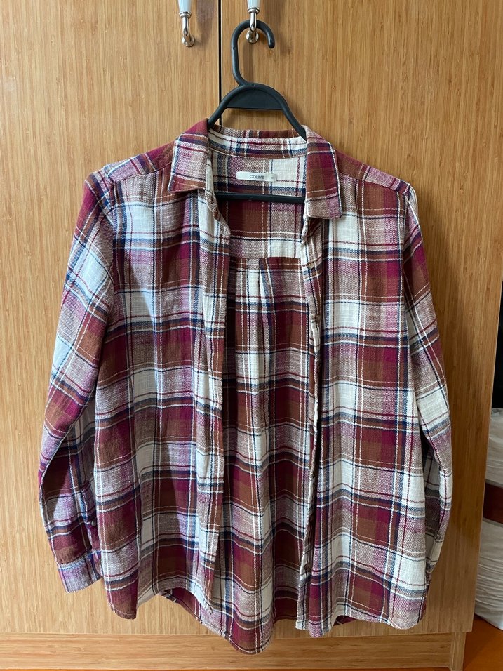 Bu bol kesim kadın gömleği, yakalı, uzun kollu ve düğmeli ön yapıya sahiptir. Yumuşak ketenden üretilmiş, koyu bordo ekoseli desene sahiptir. Günlük ve bohem tarzlar için uygundur.