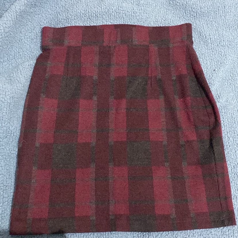 Bordo renkli, ekoseli ve düğmeli dar kesim mini etek, günlük sokak stiline uygun.