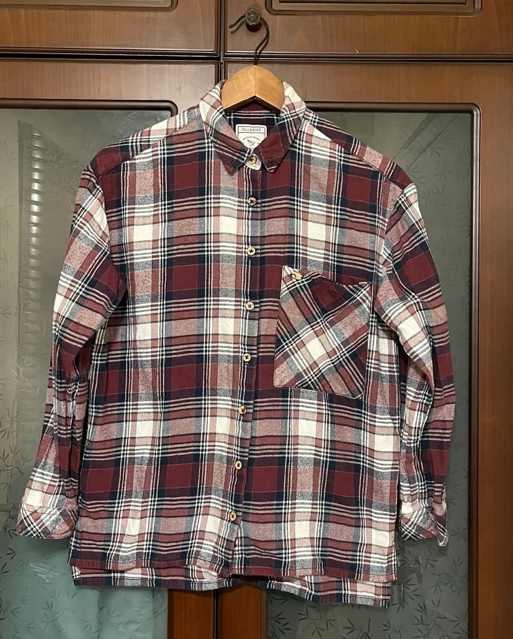 Düğmeli, uzun kollu, bordo pamuklu gömlek. Ekoseli desenli, yakalı ve bol kesim, günlük kullanım için uygundur.
