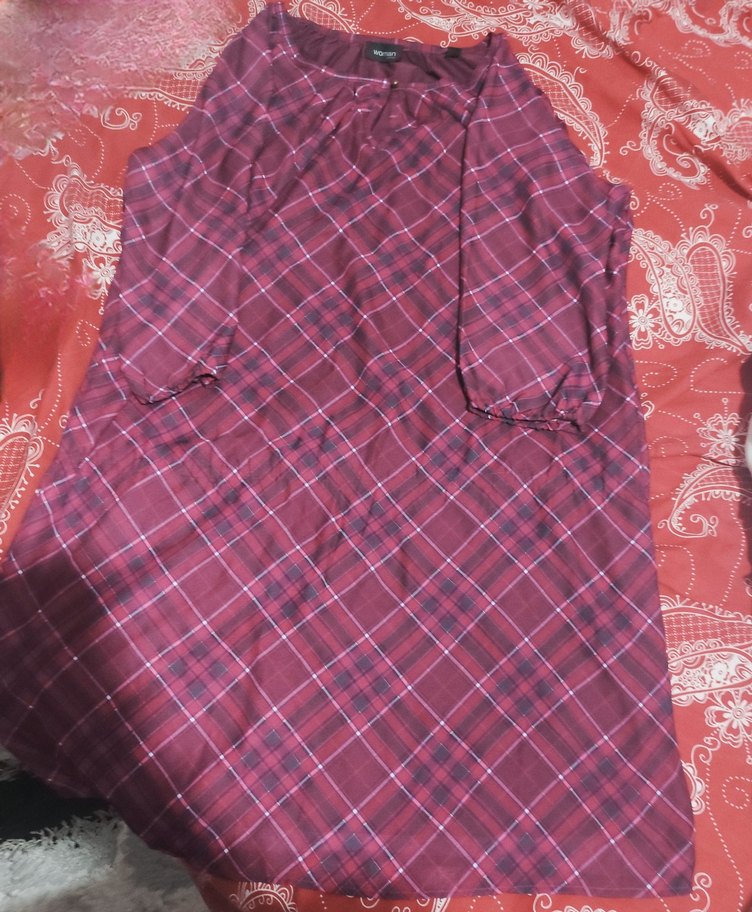 Bordo ekoseli hamile tunik, salaş kesim, kısa kollu ve kayık yaka detaylıdır. Midi boy ve drapeli tasarıma sahiptir.