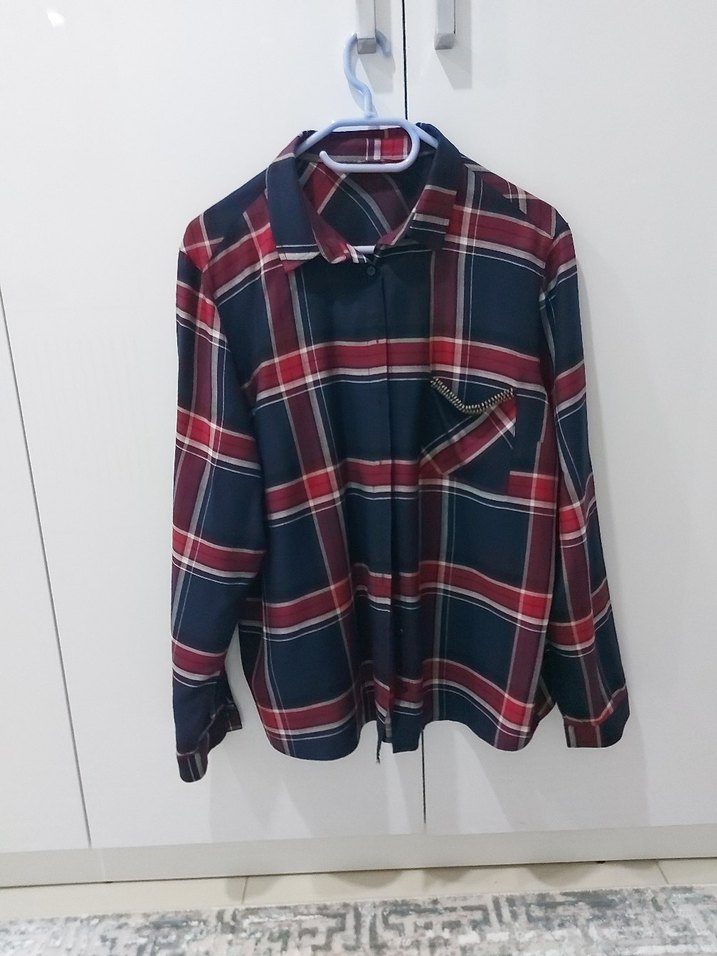Bordo renginde, düğmeli, uzun kollu ve bol kesim kadın gömleği. Notlu yakalı, rahat ve ekoseli desene sahip, günlük kullanım için ideal.