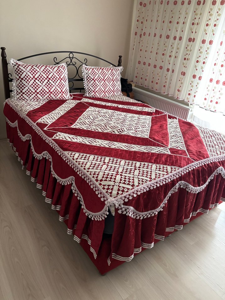 Koyu bordo renkli, nakışlı ve fırfırlı kenarlı yatak örtüsü. Üzerine uyumlu nakışlı yastıklar da dahildir. ️