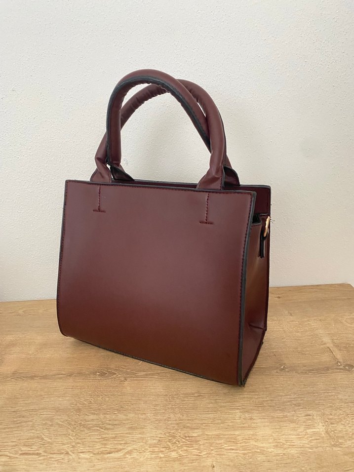 Bordo deri kadın el çantası, modern klasik tasarıma sahiptir ve tokalı detay içerir. Minimalist, desensiz stili günlük kullanıma uygundur ve şıklık katar.