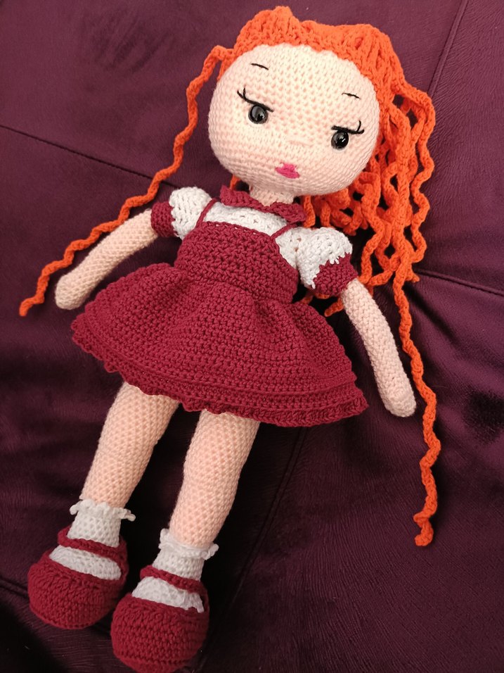 Canlı turuncu saçlı, bordo el örgüsü elbise giymiş renkli el yapımı bebek. Yüz detayları ve uyumlu ayakkabılar bulunur.