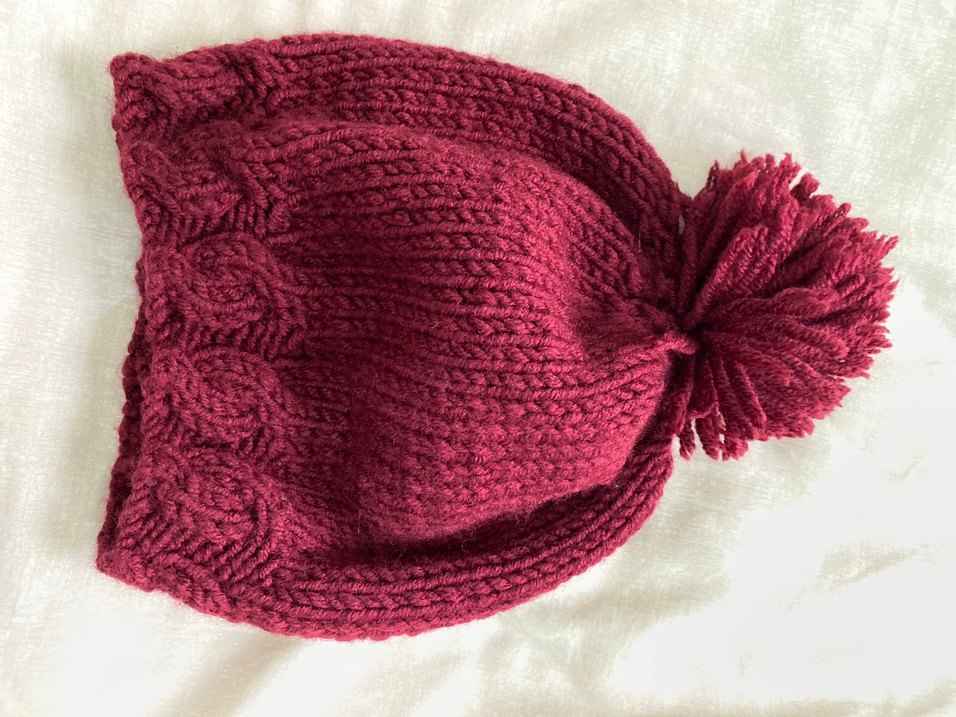 Bordo renkli, el örgüsü dokulu kadın bere, bohem tarzda rahat ve renkli bir görünüm sunar. Üstünde ponpon bulunmaktadır.