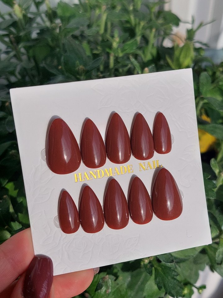 Parlak yüzeyli, koyu bordo renkte el yapımı takma tırnak seti. Doğal ve şık bir görünüm sağlar. İstediğiniz bedende yapılır.