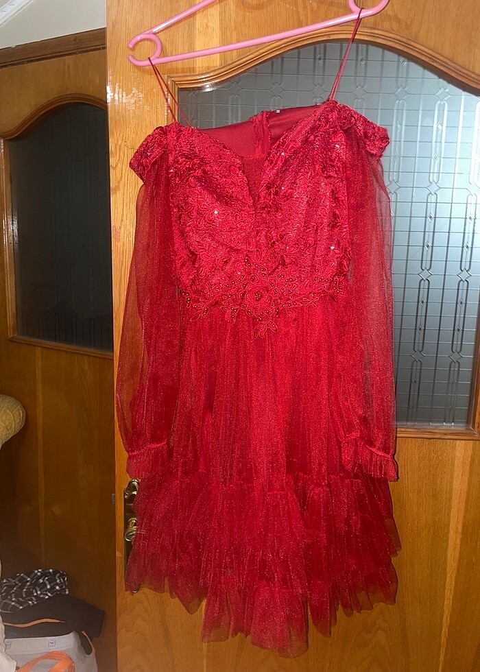 elbise flaşla çekildiği için kırmızı çıkmış ama daha koyu bi renk o kadar güzel duruyo ki küçüldüğü için satıyorum diz kapağı üstüne geliyor boyu 36 beden bana olsa kesinlikle mezuniyetimde giyerdim