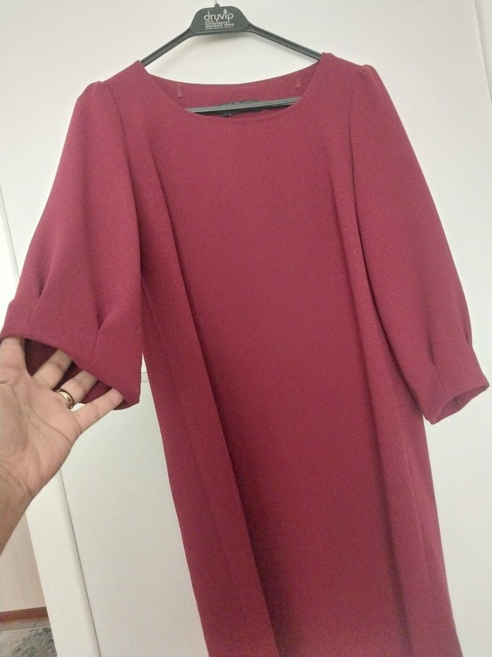 Bordo renkli hamile tunik, salaş kesim, kısa kollu ve drapeli detaylıdır. Yuvarlak yakalı ve parlak yüzeylidir, ofis için uygundur.