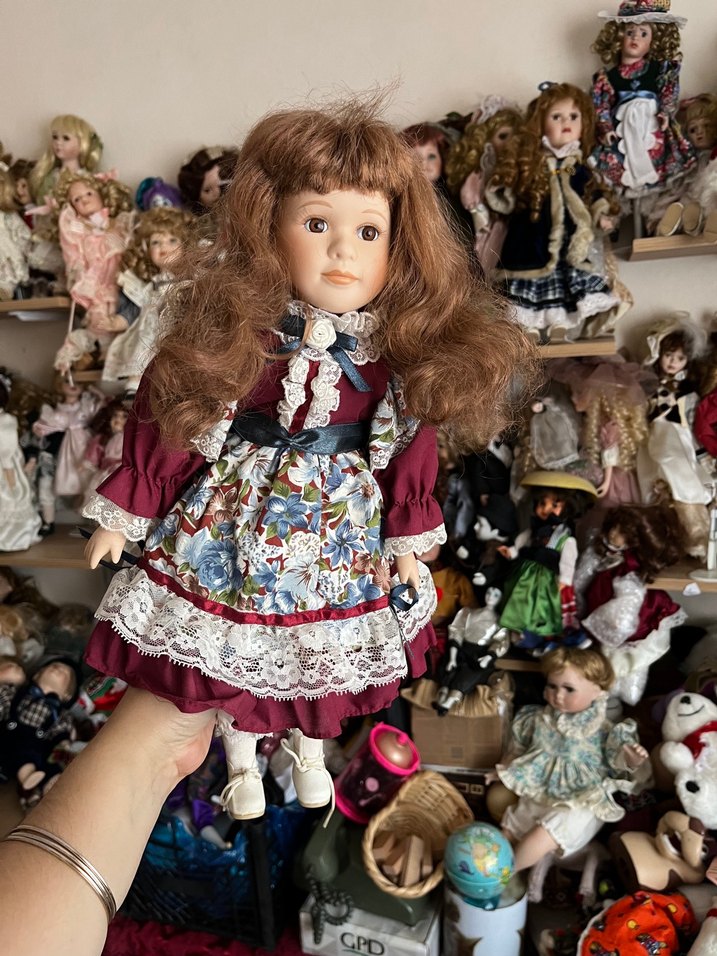 Kahverengi kıvırcık saçlı, bordo elbiseli, detaylı çiçekli ve dantelli kıyafete sahip koleksiyonluk bebek.