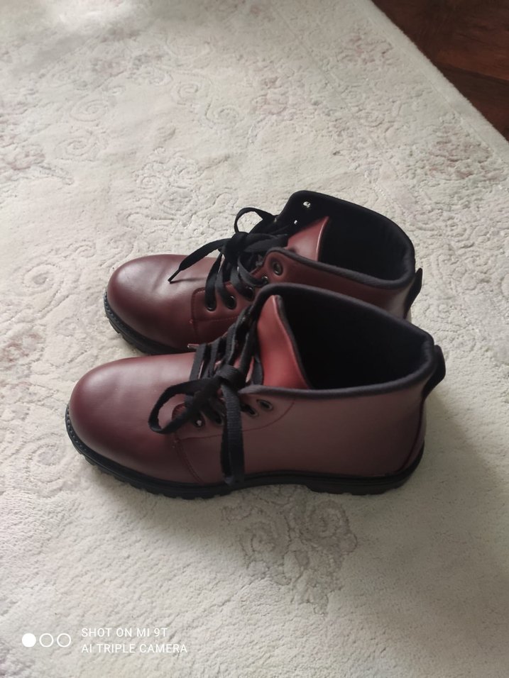 Bordo renkte, düz tasarımlı erkek botları. Siyah bağcıklarla minimalist ve zahmetsiz şıklık sunar. Koyu renk kombinlere uygundur.