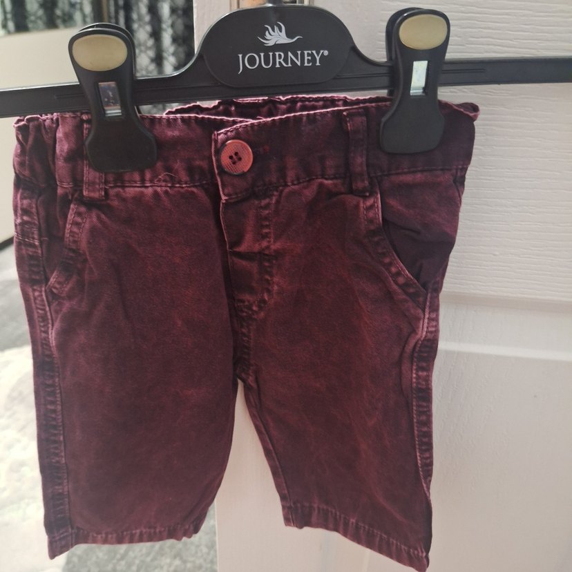 Bordo renkli, bağcıklı düğmeli, yumuşak süet kumaştan yapılmış, fitted kesim erkek çocuk şortu. Koyu renkli batik desenlidir, sokak modasına uygundur. 92 - 2 yaş.