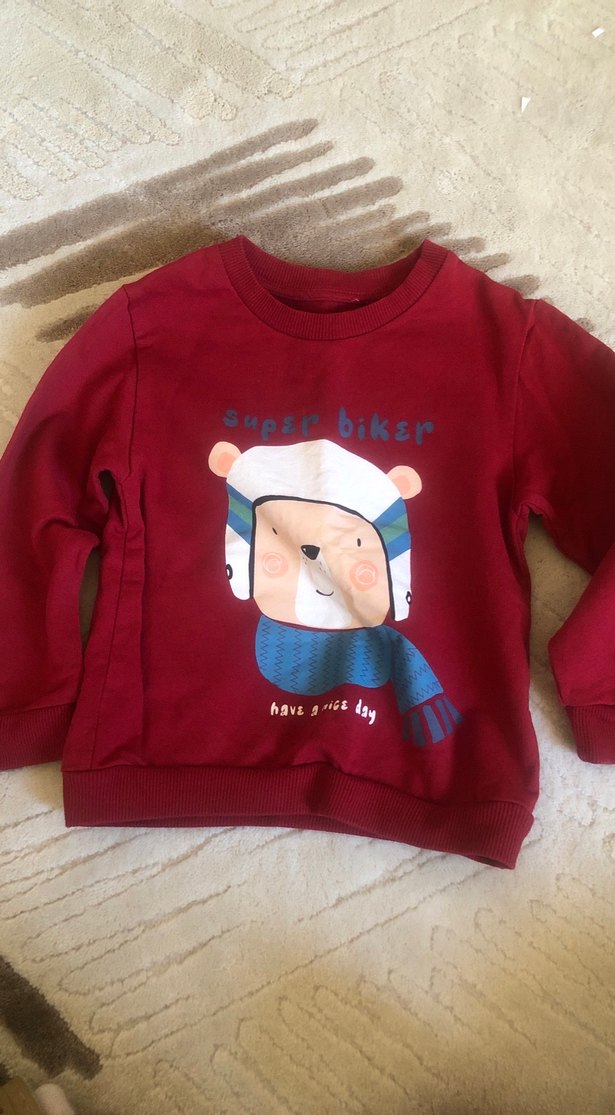 Bordo renkli, uzun kollu, bisiklet yaka erkek çocuk sweatshirt. Yumuşak ve sıcak kumaştan, renkli baskılı ayı figürü ve örme detaylıdır.